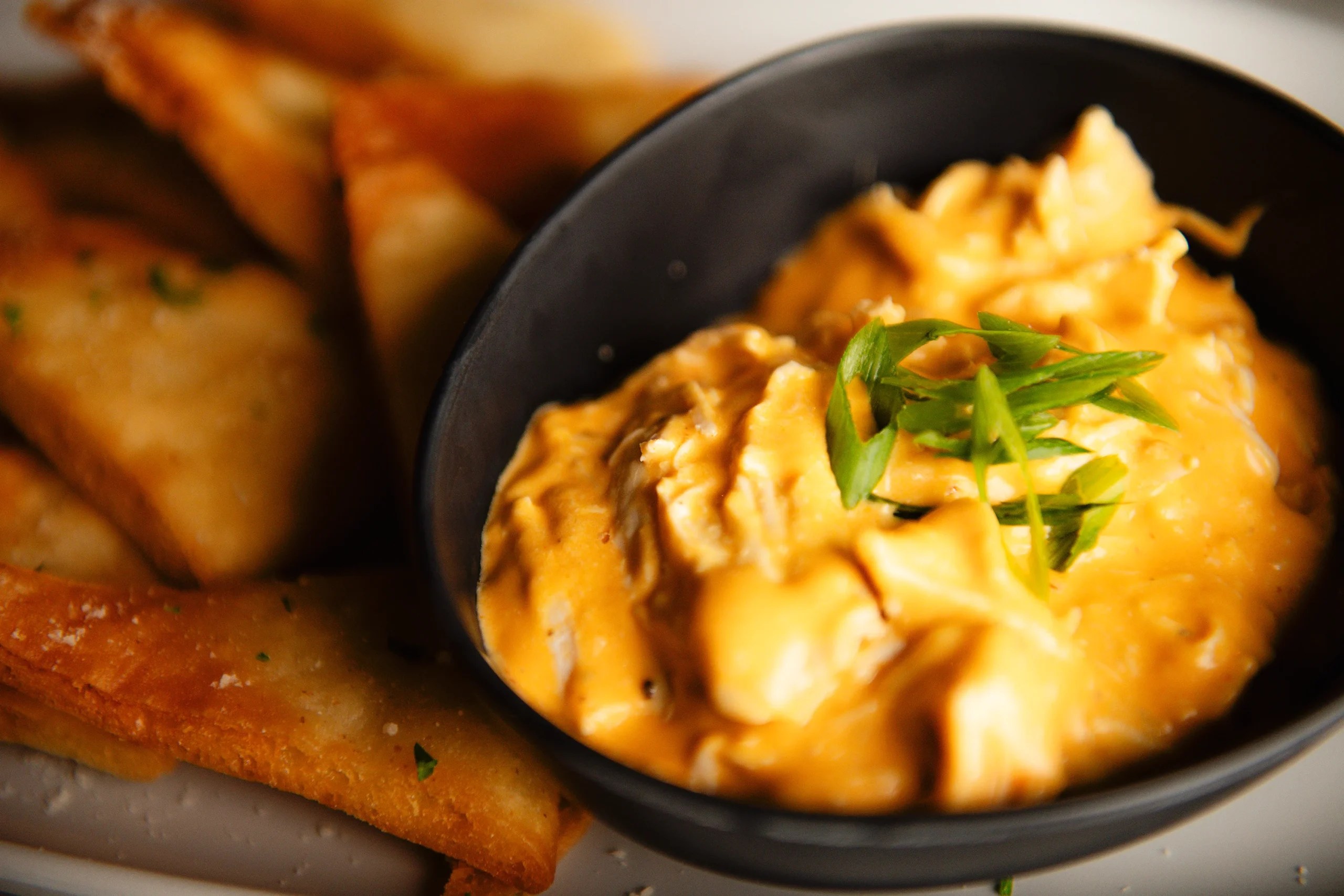 Fried pita triangles with creamy buffalo chicken dip, green onions, and crema drizzle.