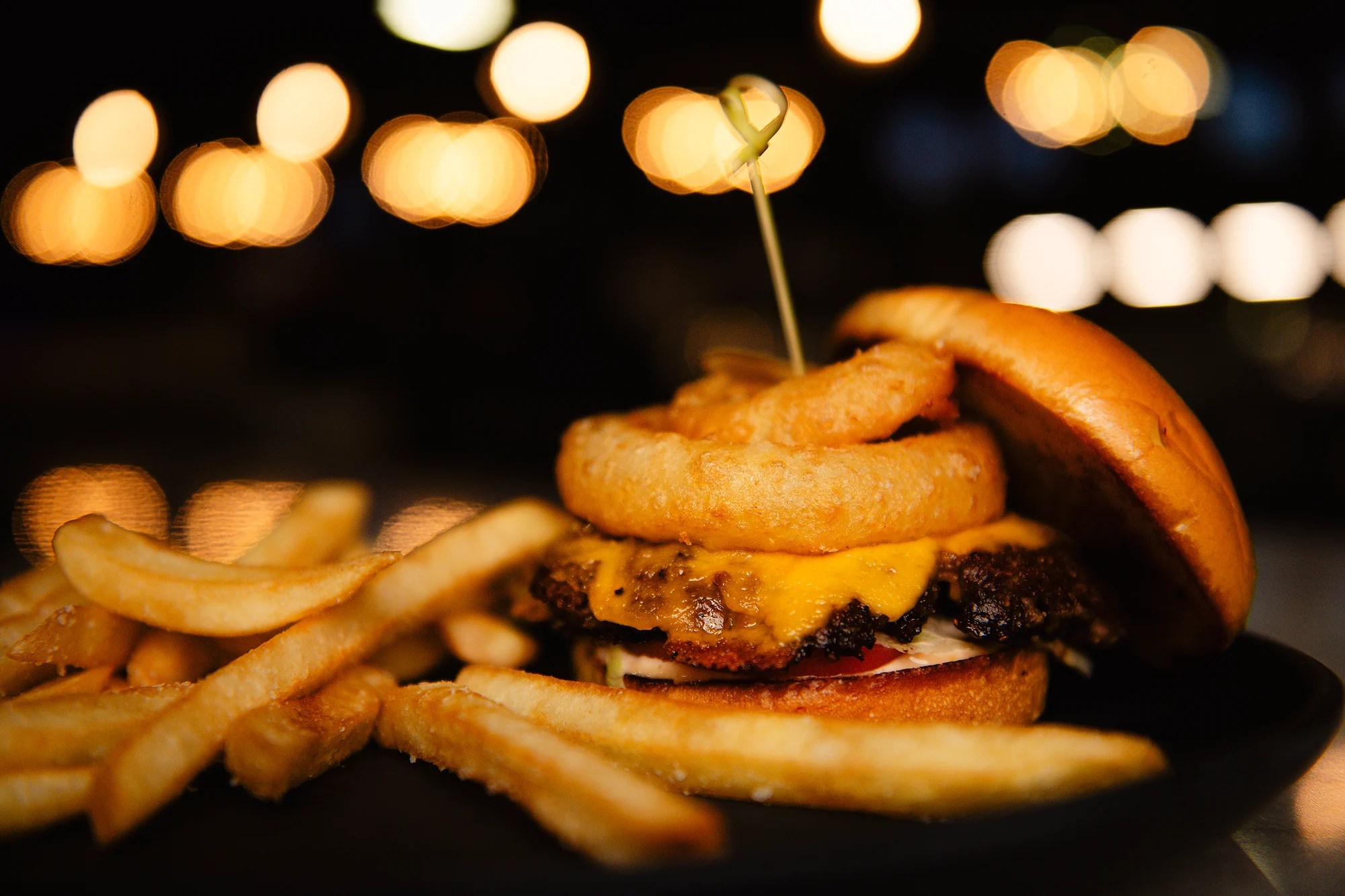 Smashed burger with cheddar, BBQ sauce, onion rings, lettuce & tomato.