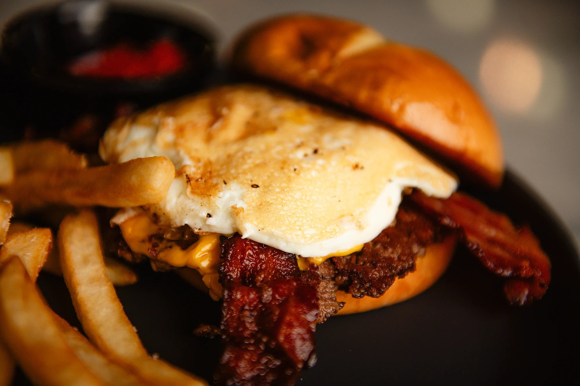 Beef patty, bacon, fried egg, American cheese, and house aioli on a bun.