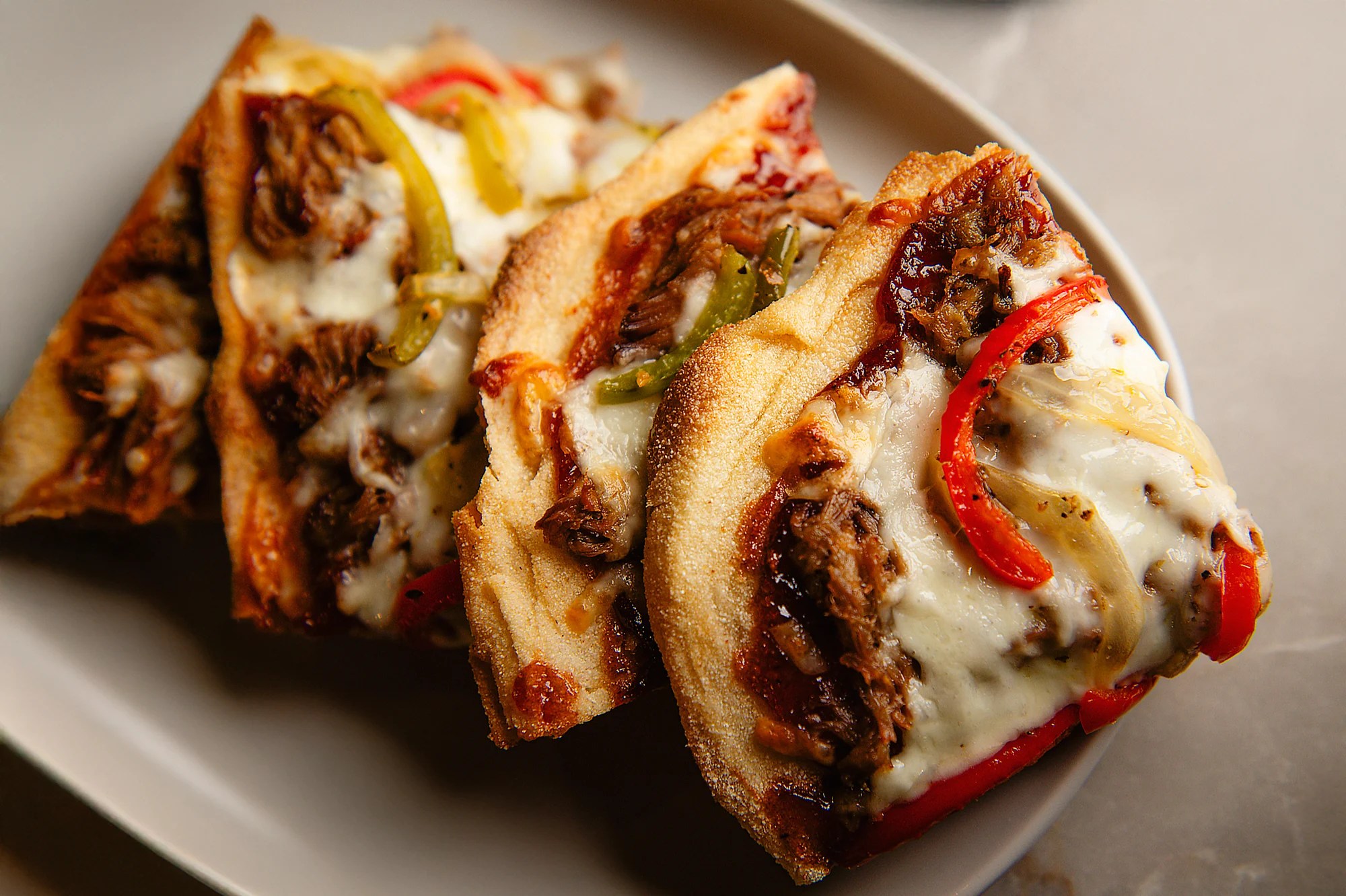 Braised pork, mozzarella, peppers & onions, finished with BBQ sauce.