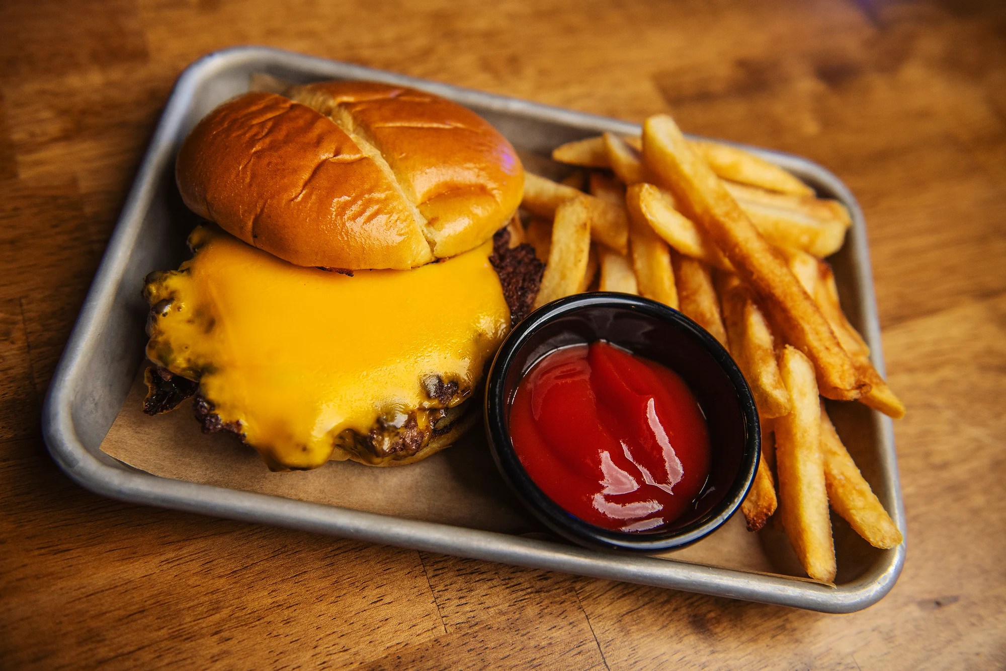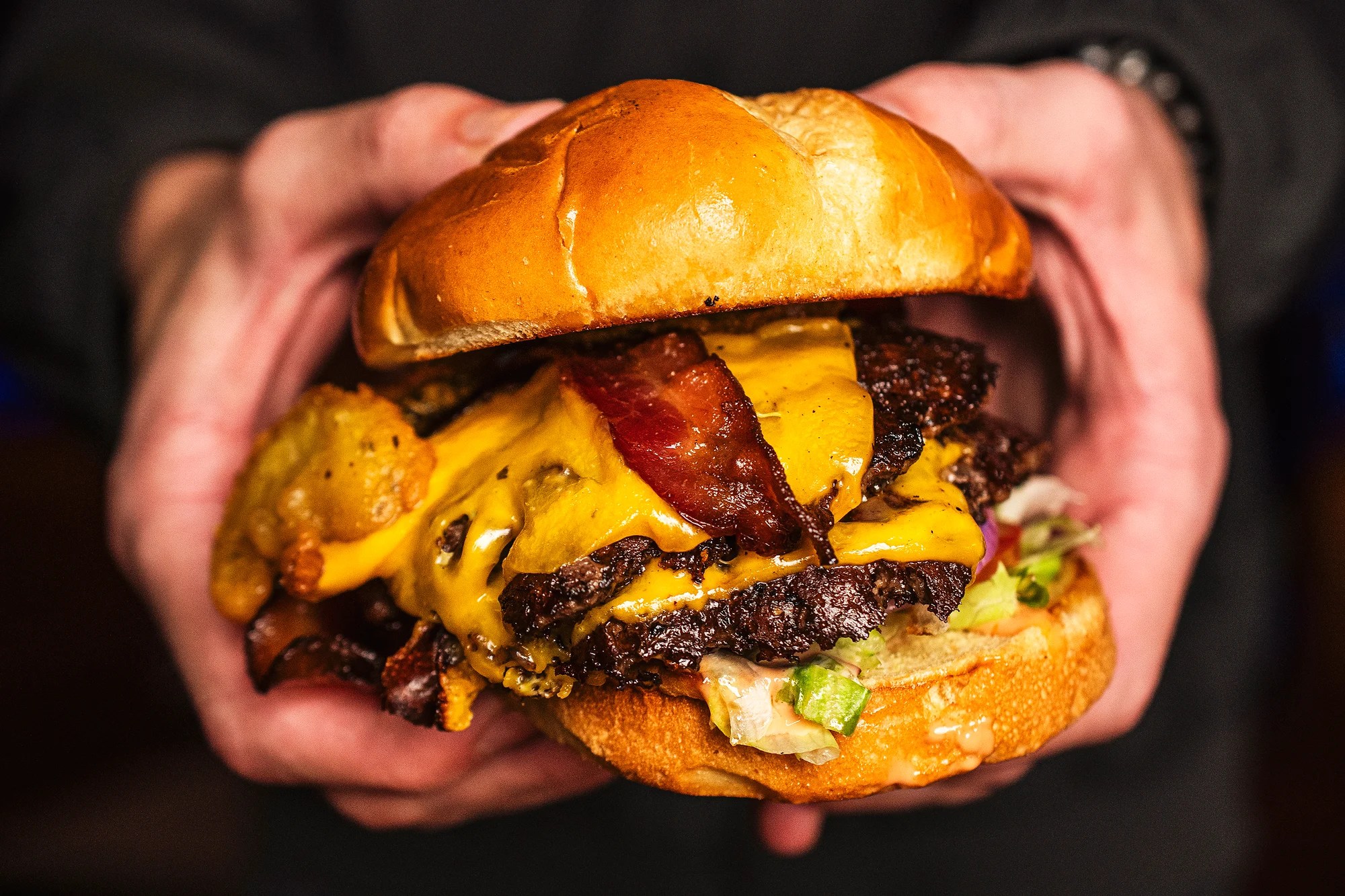 Double beef patties, American cheese, bacon, lettuce, tomato, onion, fried pickles & Union sauce on a toasted bun.