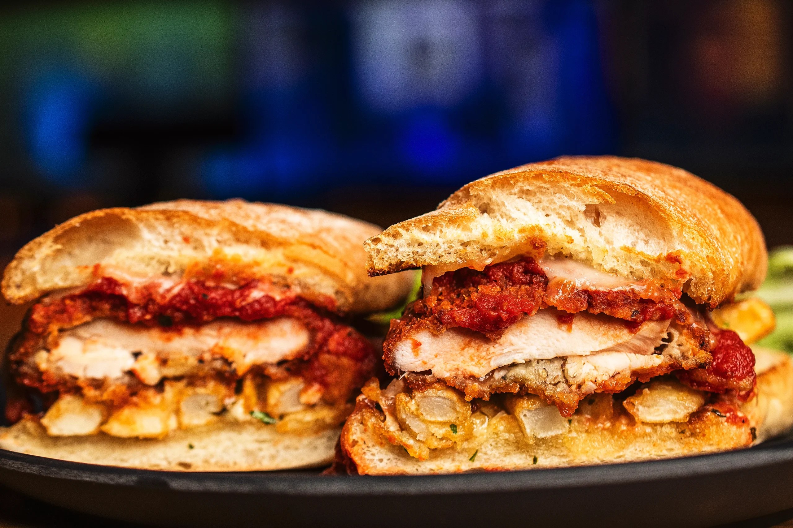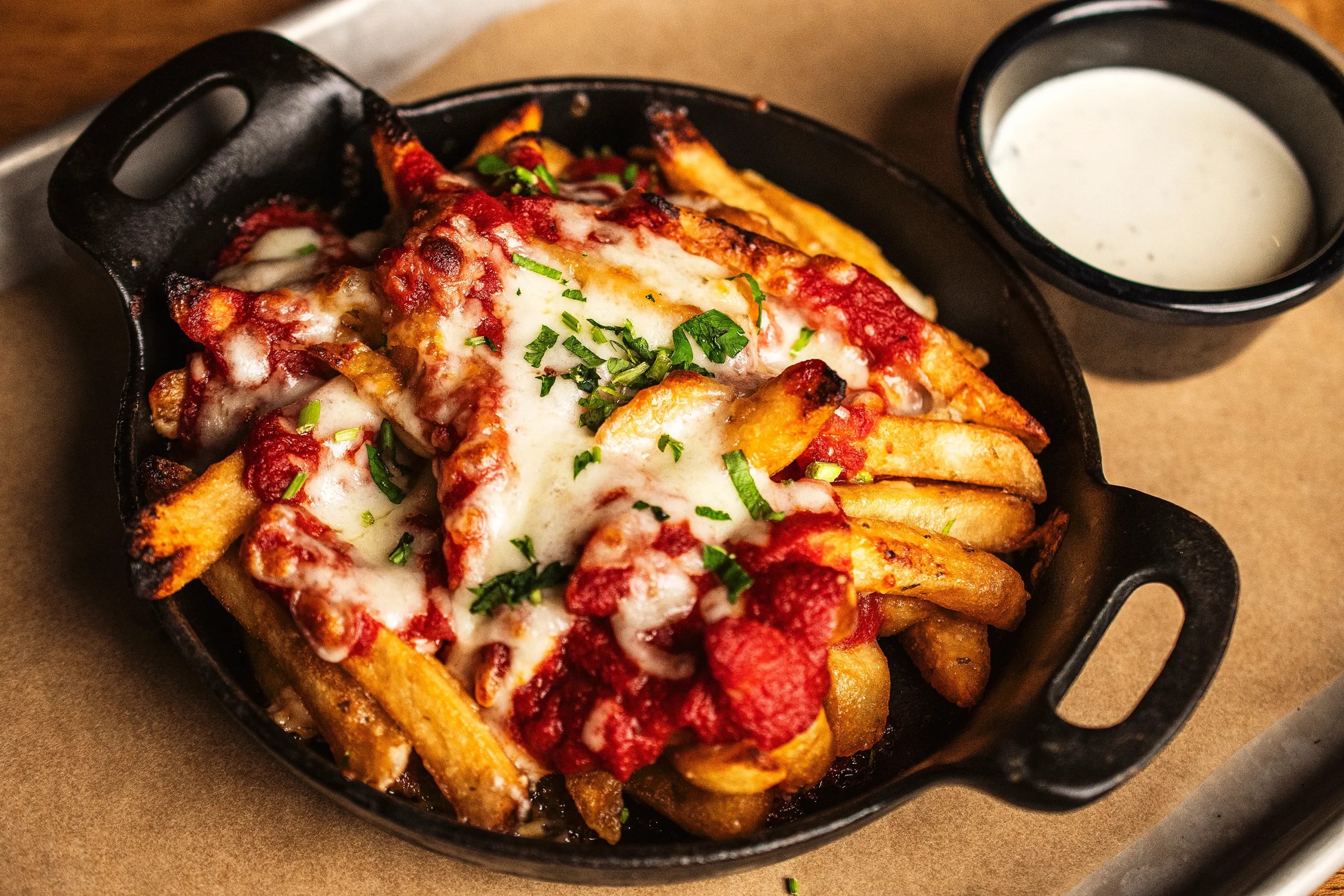 Fried chicken topped with marinara, mozzarella, and crema on garlic parmesan fries and ciabatta.