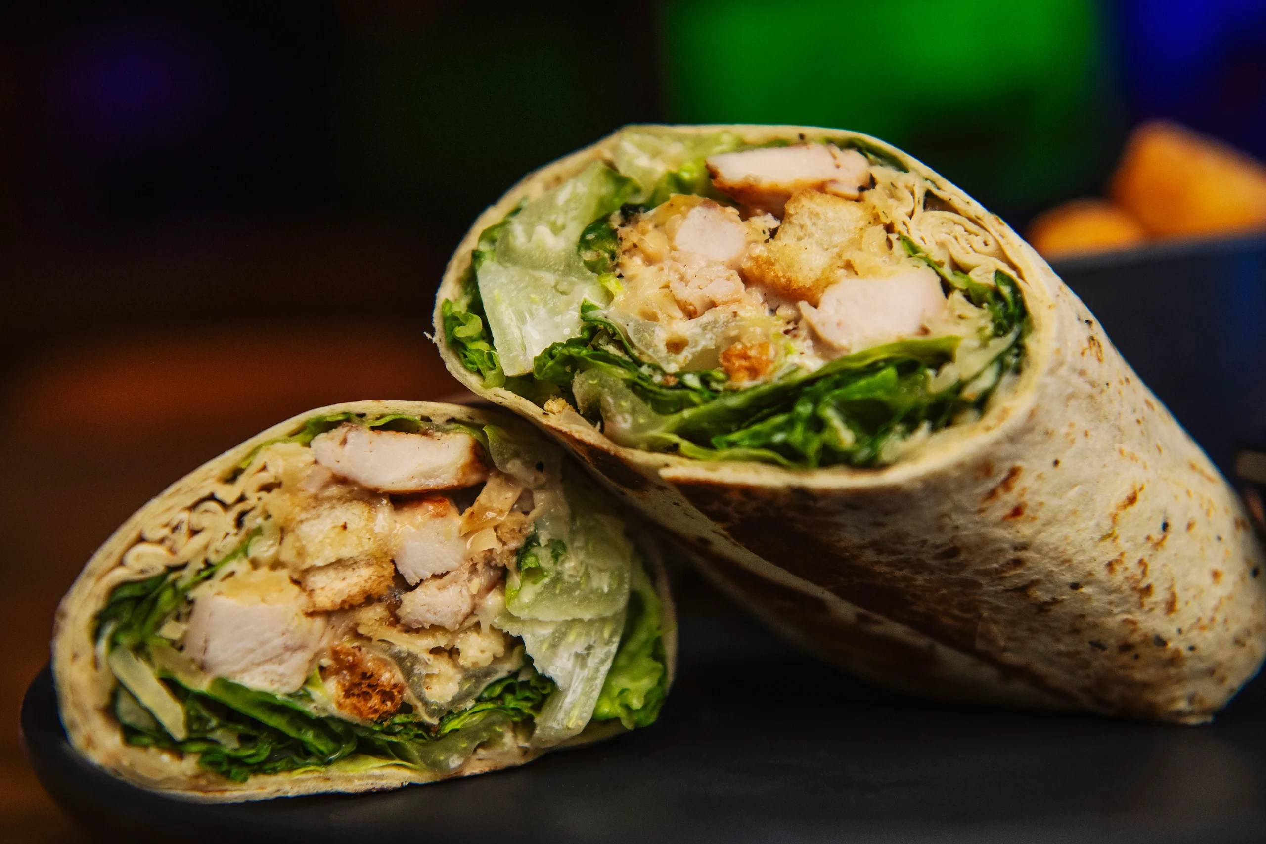 Grilled chicken, romaine, Caesar dressing, parmesan & croutons in an herb tortilla.