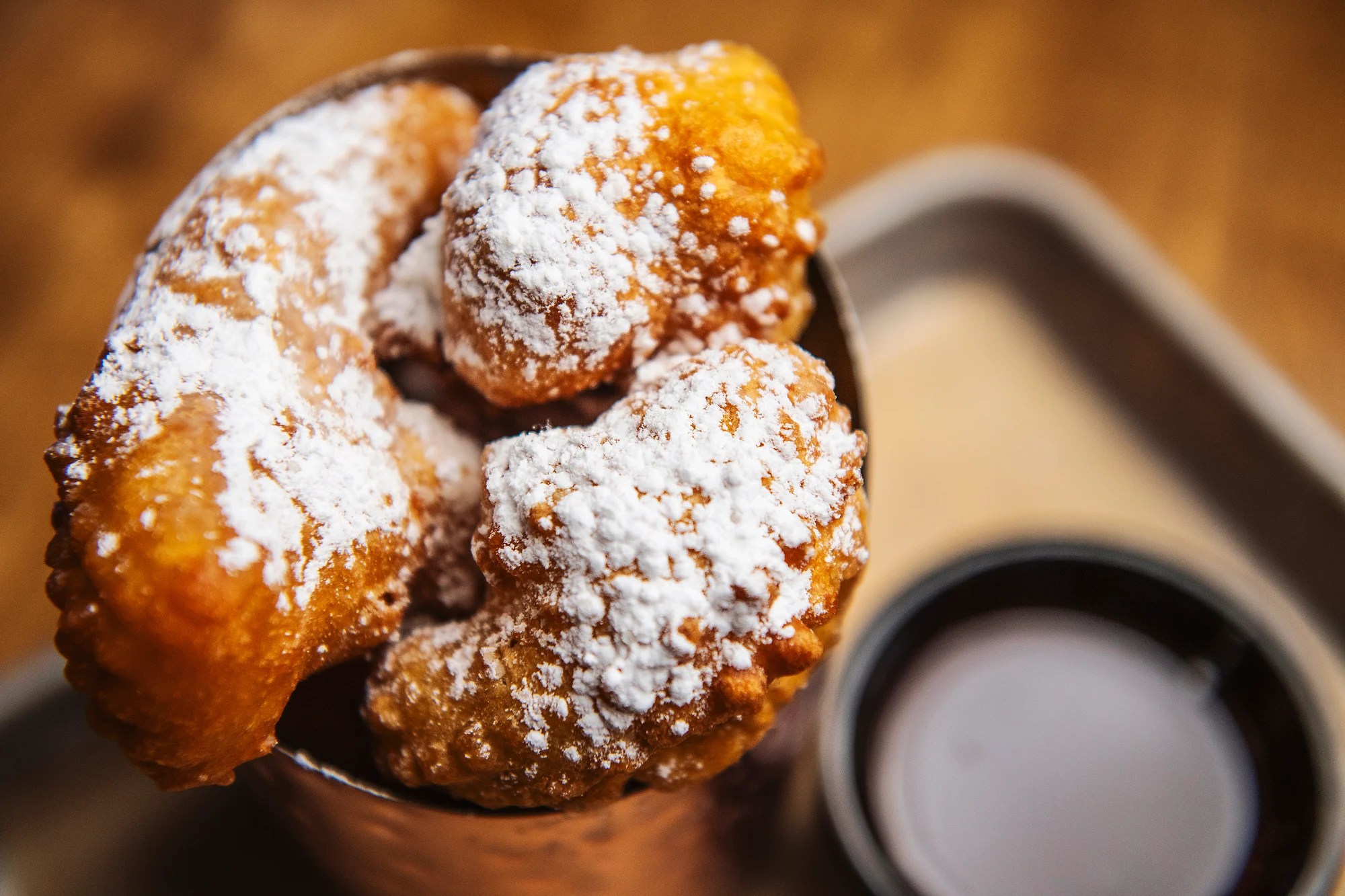 Cake-batter fries with chocolate sauce and powdered sugar.