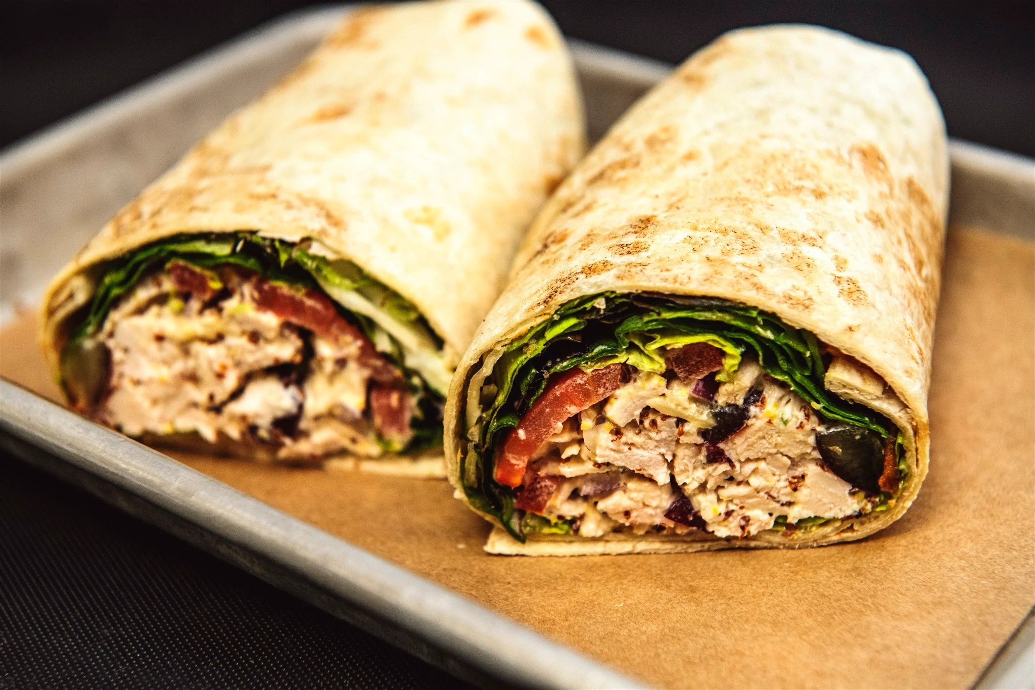 House-made chicken salad with grapes, almonds, bacon, lettuce, tomato, and onion in a hero tortilla.